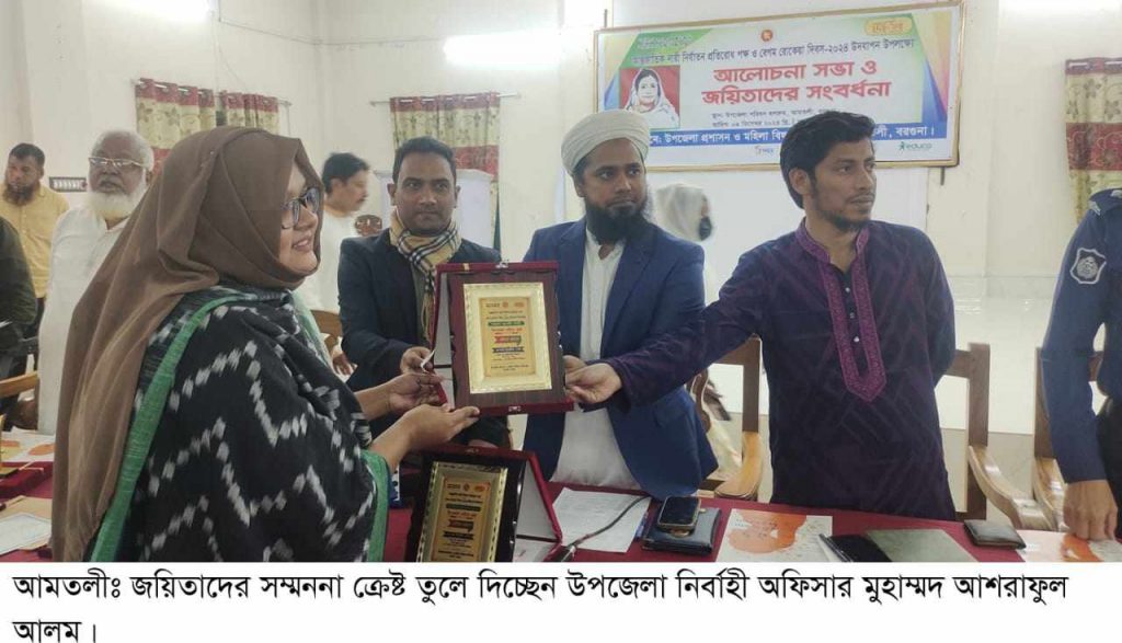 উপজেলা মহিলা বিষয়ক অধিদপ্তরের প্রশিক্ষক সামসুন্নাহার বেগমের সভাপতিত্বে সংবর্ধনা অনুষ্ঠানে প্রধান অতিথি ছিলেন উপজেলা নিবার্হী অফিসার মুহাম্মদ আশরাফুল আলম। বিশেষ অতিথি ছিলেন উপজেলা সহকারী কমিশনার (ভুমি) তারেক হাসান, মেডিকেল অফিসার মোঃ সবুজ মিয়া, ওসি (তদন্ত) মোঃ আমির হোসেন সেরনিয়াবাদ, আমতলী সাংবাদিক ইউনিয়ন সভাপতি মোঃ জসিম উদ্দিন সিকদার।