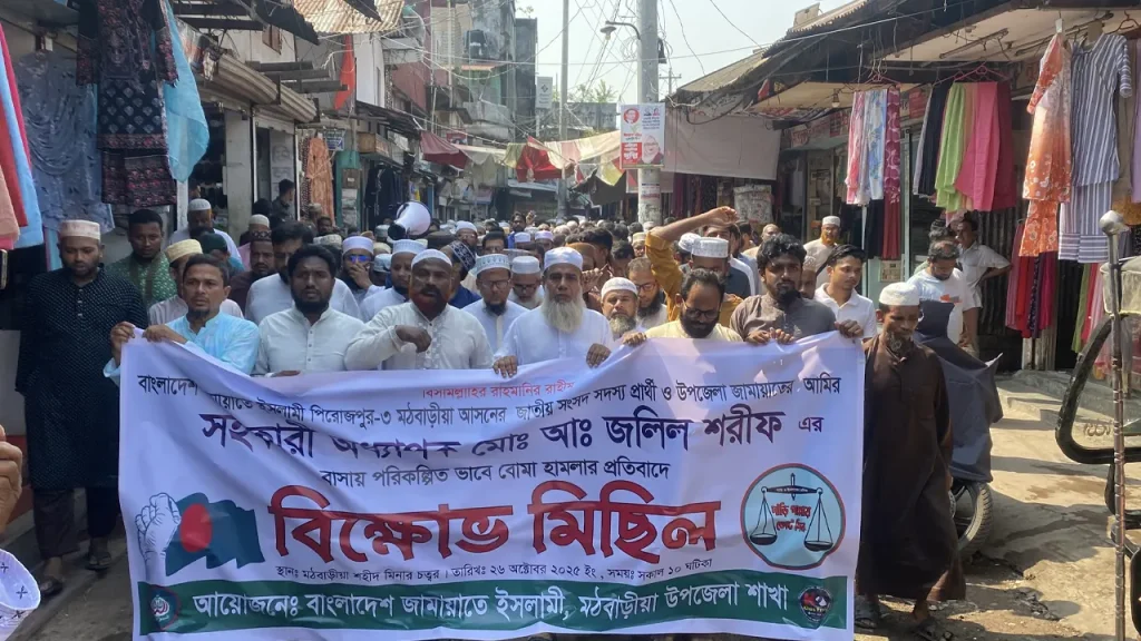রোববার (২৬ অক্টোবর) সকালে এ ঘটনার প্রতিবাদে উপজেলা শহীদ মিনার প্রাঙ্গণ থেকে বিক্ষোভ মিছিল বের করে বিভিন্ন সড়ক প্রদক্ষিণ শেষে পুনরায় শহীদ মিনারে এসে সমাবেশ করেন জামায়াতে ইসলামীর নেতাকর্মীরা।