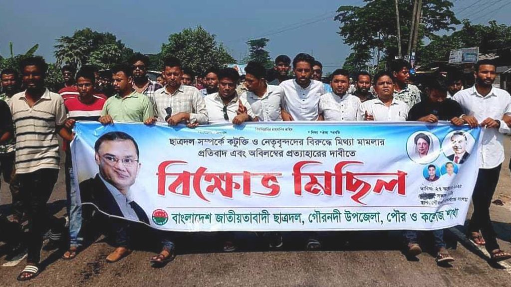বরিশালের গৌরনদীতে বিক্ষোভ মিছিল ও সমাবেশ করেছে ছাত্রদল। তুচ্ছ ঘটনাকে কেন্দ্র করে বরিশাল জেলা, গৌরনদী উপজেলা, পৌর ও কলেজ শাখা ছাত্রদলের নেতাদের বিরুদ্ধে মামলা দায়েরের প্রতিবাদে এ বিক্ষোভ করে তারা।