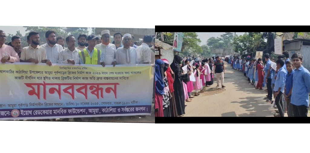 ঝালকাঠি উপজেলার আমুয়া হাসপাতাল সংলগ্ন ধোপার নদীর উপর নির্মানাধীন বন্ধ হওয়া ব্রিজের কাজ দ্রুত শেষ করার দাবিতে এলাকাবাসী ও শিক্ষার্থীদের মানববন্ধন, সড়ক অবরোধ ও র্যালী অনুষ্ঠিত হয়েছে। এ ব্রীজের নির্মাণ কাজ দীর্ঘদিন বন্ধ থাকায় চরম দুর্ভাগ্যে রয়েছে এলাকাবাসী। আজ ১০ নভেম্বর সোমবার সকাল ১১ টায় ইয়োথ রেডকেয়ার মানবিক ফাউন্ডেশন এর আয়োজন করেন। ব্রিজ সংলগ্ন সড়কের দু-পাশে শত শত শিক্ষার্থী ও এলাকাবাসী প্রায় এক কিলোমিটার দীর্ঘ এ মানববন্ধনে অংশ নেন। মানববন্ধনে বক্তারা জানান, ধোপার নদীর এ ব্রিজের কাজ ২০২১ -২০২২ অর্থবছরে শুরু করা হয়, ২০২৩ সালে শেষ হওয়ার কথা থাকলেও আজও শেষ হয়নি ব্রিজর ২০ শতাংশ কাজ। ঠিকাদার কাজ ফেলে লাপাত্তা হয়ে গেছে। বিকল্প কাঠের নির্মিত লক্কর ঝক্কর ভাঙ্গাচুরা ব্রিজ দিয়ে প্রতিদিন ৯টি শিক্ষা প্রতিষ্ঠান, কাঠালিয়া উপজেলার একমাত্র আমুয়া হাসপাতাল, আমুয়া বন্দরসহ তিনটি বাজারের বিভিন্ন শ্রেনী পেশার হাজার হাজার নারী, শিশু ও রোগী যাতায়াত করছে। এলাকাবাসী ও শিক্ষার্থীরা অতি দ্রুত সময়ের মধ্যে ব্রীজটির নির্মাণ কাজ শেষ করার জন্য জোর দাবি জানিয়েছেন। মানববন্ধনে বক্তব্য রাখেন, ইয়োথ রেডকেয়ার মানবিক ফাউন্ডেশন সভাপতি মোঃ মেহেদী হাসান, আমুয়া মাধ্যমিক বিদ্যালয়ের প্রধান শিক্ষক, মনজুরুল হক,বাংলাদেশ জামাতে ইসলামীর কাঠালিয়া উপজেলা আমির মাস্টার মোঃ মজিবুর রহমান, আমুয়া ইউনিয়ন পরিষদ চেয়ারম্যান নকিরুল ইসলাম, ইউনিয়ন বিএনপি’র সাধারণ সম্পাদক আব্দুল মন্নান তালুকদার, যুবদল নেতা তুহিন মিয়া, শেখ ফজিলাতুন্নেছা ভোকেশনাল ইনস্টিটিউটের প্রধান শিক্ষক মাহবুবুর রহমান, শিক্ষার্থী সামিরা আক্তার ও অরিন্দ্র মজুমদার।