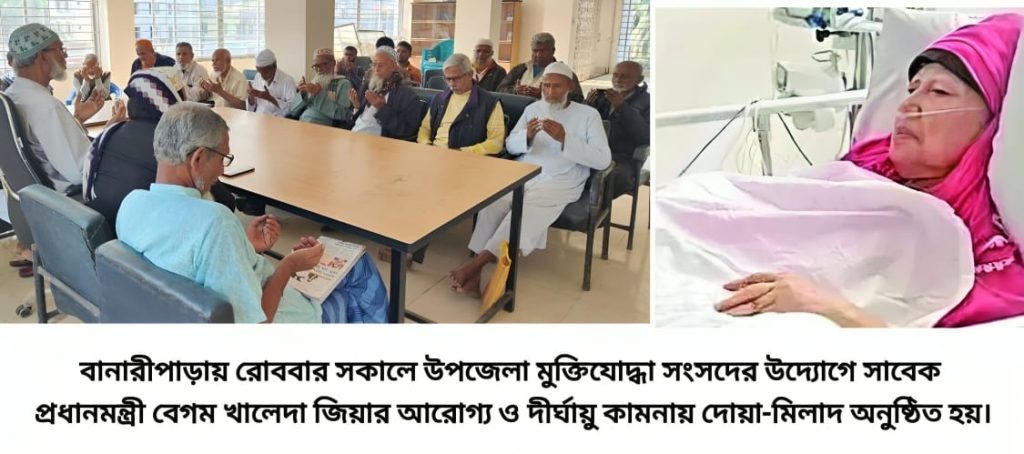বরিশালের বানারীপাড়ায় উপজেলা মুক্তিযোদ্ধা সংসদের উদ্যোগে বিএনপি চেয়ারপার্সন ও তিনবারের সাবেক প্রধানমন্ত্রী বেগম খালেদা জিয়ার রোগমুক্তি,সুস্থতা ও দীর্ঘায়ু কামনায় দোয়া-মিলাদ অনুষ্ঠিত হয়েছে। রোববার (৩০ নভেম্বর) সকাল ১১টায় বানারীপাড়া উপজেলা মুক্তিযোদ্ধা সংসদ কমপ্লেক্স মিলনায়তনে অনুষ্ঠিত এ দোয়া-মিলাদে প্রধান অতিথি ছিলেন বরিশাল জেলা মুক্তিযোদ্ধা সংসদের যুগ্ম আহবায়ক ও বানারীপাড়া পৌর বিএনপির সাবেক সভাপতি বীর মুক্তিযোদ্ধা মোঃ খলিলুর রহমান চোকদার। বানারীপাড়া উপজেলা মুক্তিযোদ্ধা সংসদের আহবায়ক আইনুল হকের সভাপতিত্বে এ দোয়ানুষ্ঠানে