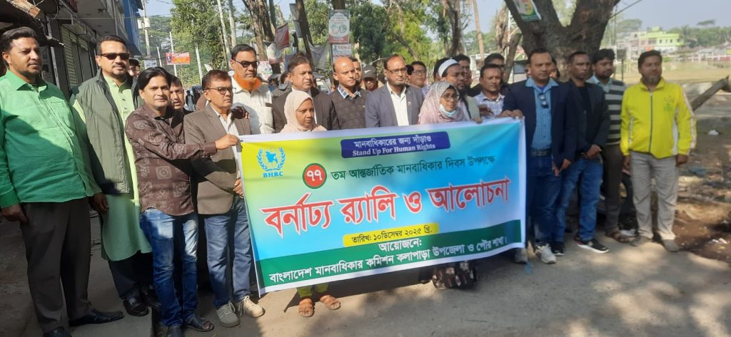 প্রতিনিধি, কলাপাড়া (পটুয়াখালী)পটুয়াখালীর কলাপাড়ায় “মানবাধিকার আমাদের প্রতিদিনের অপরিহার্য” প্রতিপাদ্যকে সামনে রেখে ৭৭ তম আন্তর্জাতিক মানবাধিকার দিবস উপলক্ষে বর্নাঢ্য র্যালি ও আলোচনা অনুষ্ঠিত হয়েছে। আজ বুধবার সকাল দশটায় বাংলাদেশ মানবাধিকার কমিশন কলাপাড়া উপজেলা ও পৌর শাখা এর আয়োজন করে।জাতিসংঘের একটি আহ্বান এবং মানবাধিকার দিবসের মূল বার্তা, যা বৈষম্যহীনভাবে সকলের অধিকার নিশ্চিত করতে ব্যক্তি, সম্প্রদায় ও বিশ্বকে একত্রিত করতে “মানবাধিকারের জন্য দাঁড়াও” লেখা সংবলিত ব্যানার হাতে র্যালিটি কলাপাড়া প্রেসক্লাব চত্বর থেকে শুরু হয়ে পৌরশহরের গুরুত্বপূর্ণ সড়কগুলো প্রদক্ষিণ শেষে একই স্থানে আলোচনা অনুষ্ঠানে মিলিত হয়।