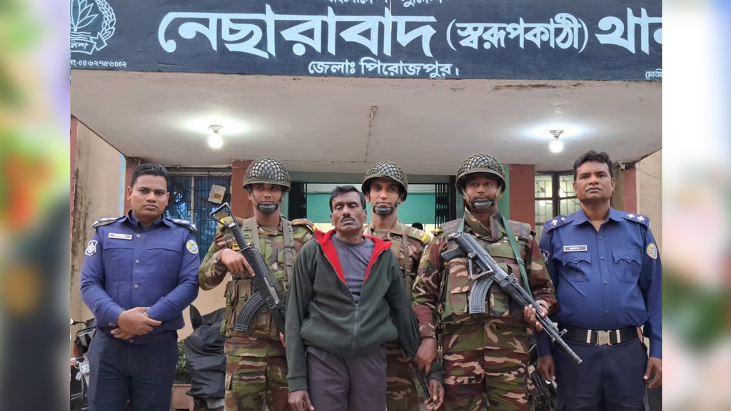 পিরোজপুরের নেছারাবাদে দীর্ঘদিন পলাতক থাকা দুর্ধর্ষ সন্ত্রাসী পরিতোষ মিস্ত্রি ওরফে কলিঙ্গকে (৬৩) গ্রেপ্তার করেছে যৌথ বাহিনী। গতকাল সোমবার (২৬ জানুয়ারি) বিকেলে উপজেলার পূর্ব জলাবাড়ি এলাকা থেকে তাঁকে গ্রেপ্তার করা হয়। আজ মঙ্গলবার সকালে তাঁকে পিরোজপুর আদালতে পাঠানোর কথা।